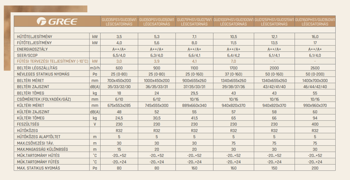 A Gree GUD160PHS / GUD160W Légcsatornás Split Klíma fontos tulajdonságai: